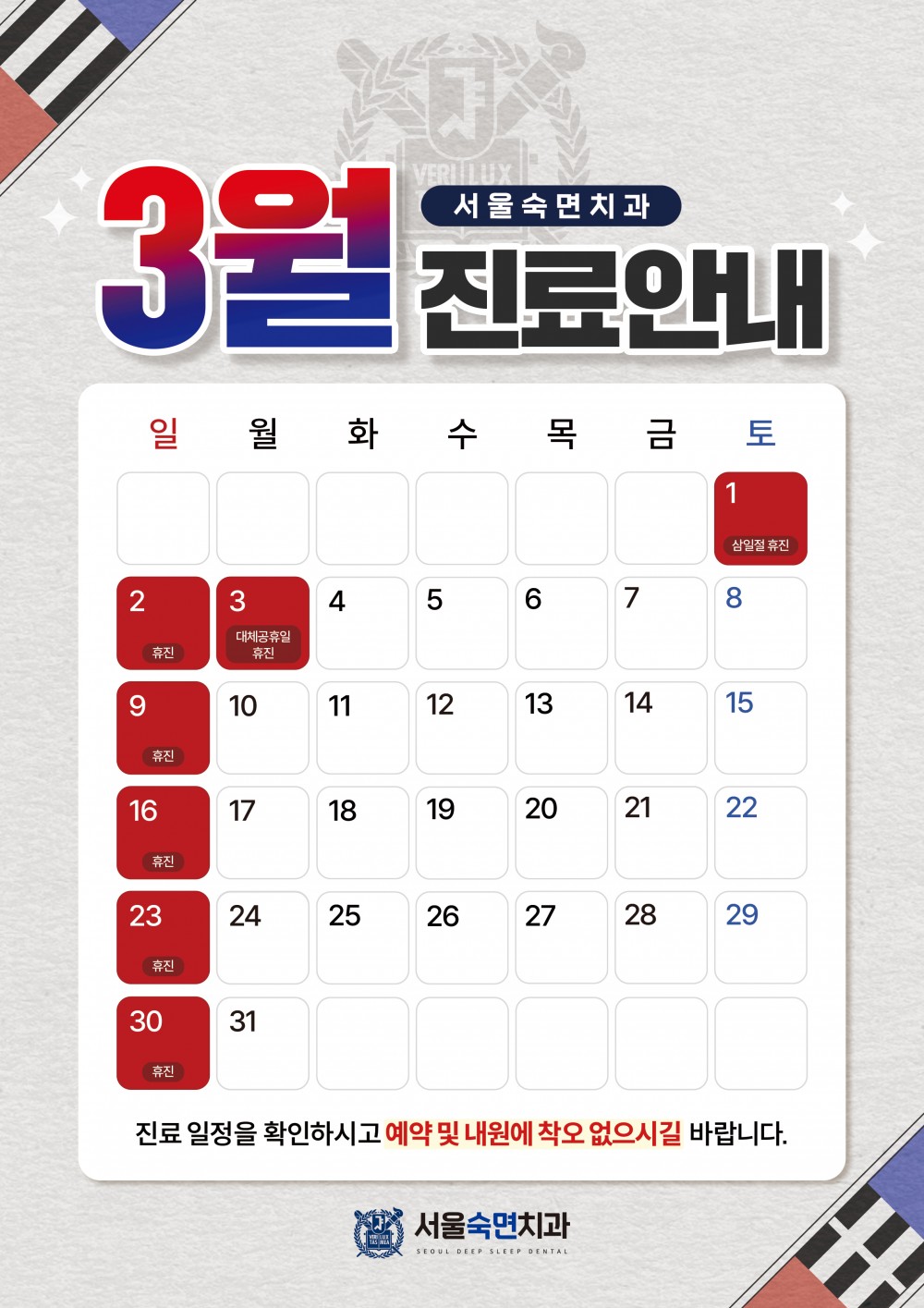 서울숙면치과 3월 진료일정 안내 페이지 정보 작성자 서울숙면치과 관련링크 본문 안녕하세요 :) 서울숙면치과 3월 진료일정 안내드립니다. 진료일정을 참고하시어 예약 및 내원에 불편함 없으시길 바랍니다.