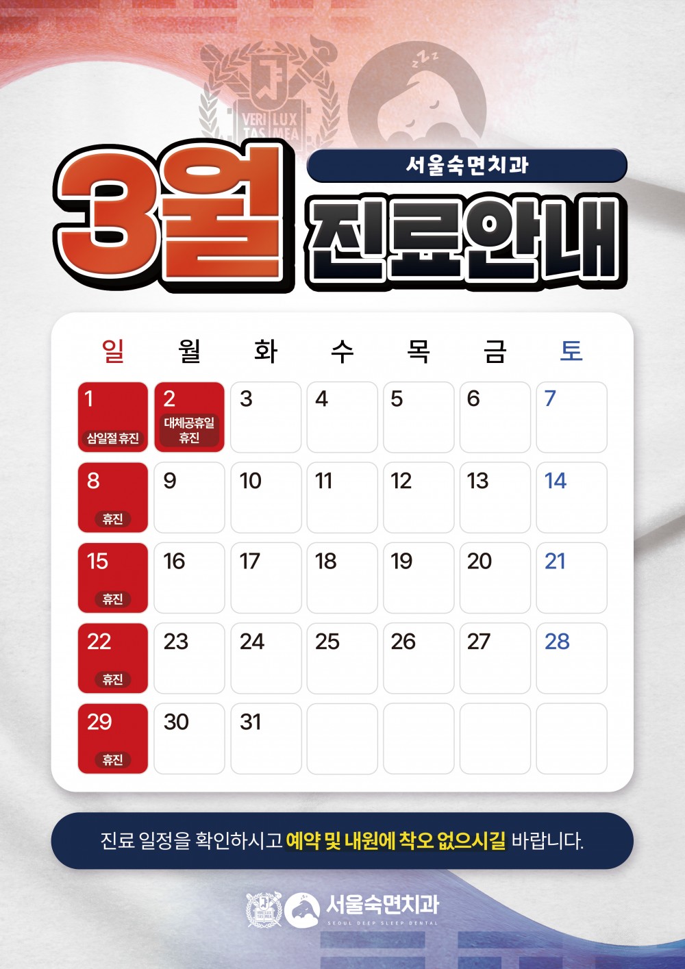서울숙면치과 3월 진료일정 안내 페이지 정보 작성자 서울숙면치과 관련링크 본문 안녕하세요 :) 서울숙면치과 3월 진료일정 안내드립니다. 진료일정을 참고하시어 예약 및 내원에 불편함 없으시길 바랍니다.