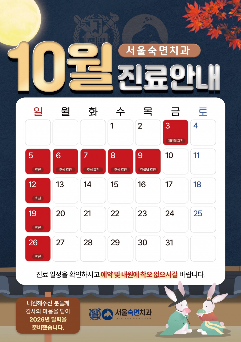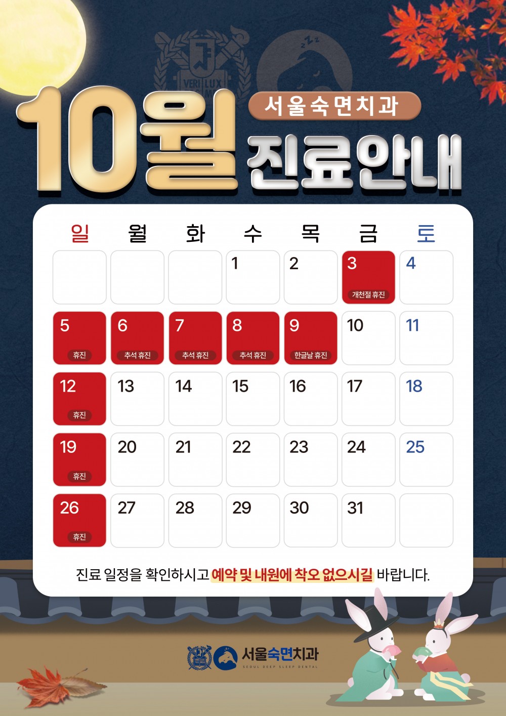 서울숙면치과 10월 진료일정 안내 페이지 정보 작성자 서울숙면치과 관련링크 본문 안녕하세요 :) 서울숙면치과 10월 진료일정 안내드립니다. 진료일정을 참고하시어 예약 및 내원에 불편함 없으시길 바랍니다.