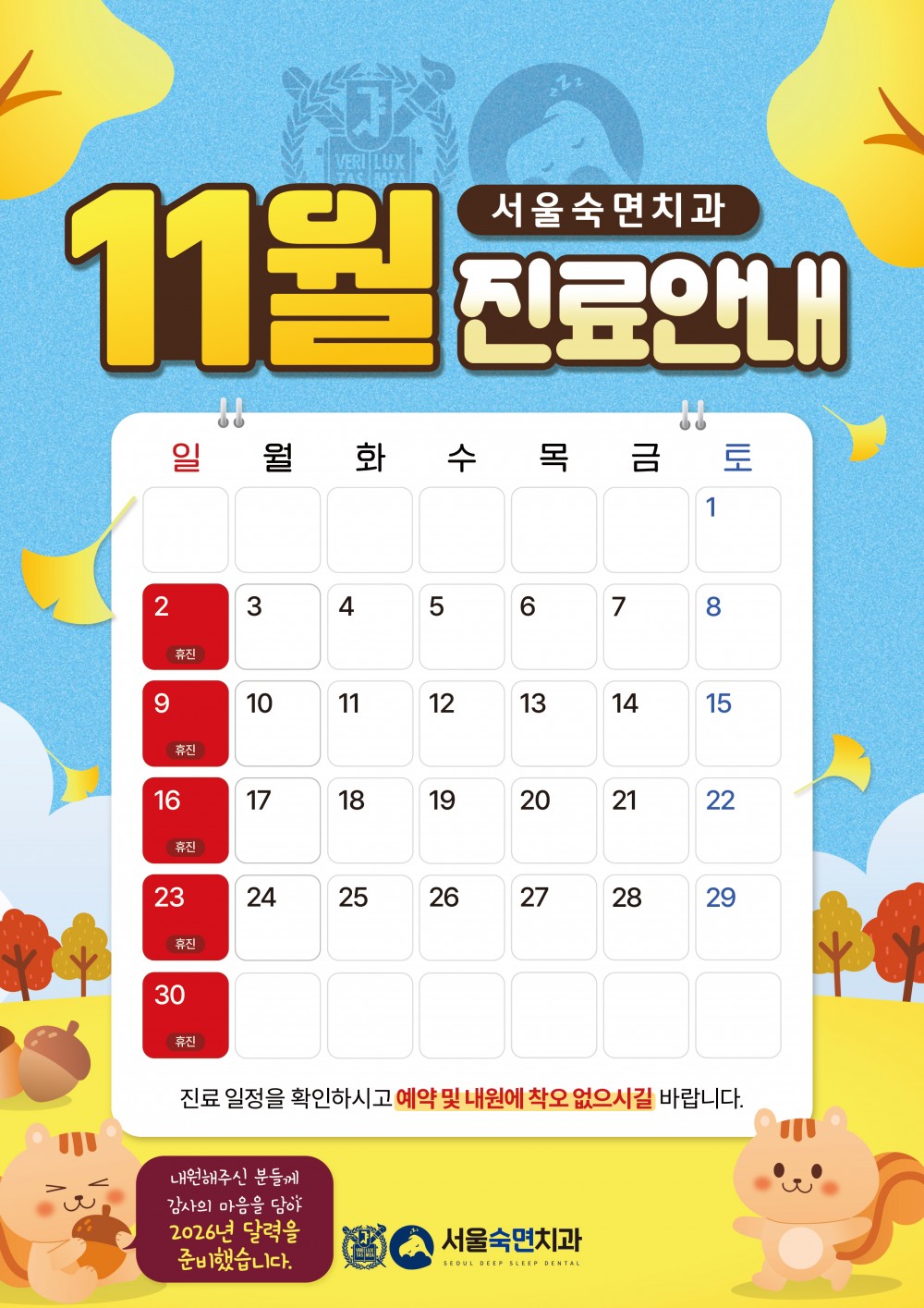 서울숙면치과 11월 진료일정 안내 > 서울숙면치과 공지사항