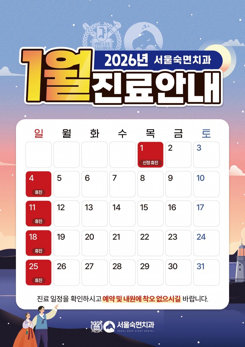 서울숙면치과 1월 진료일정 안내 페이지 정보 작성자 서울숙면치과 관련링크 본문 안녕하세요 :) 서울숙면치과 1월 진료일정 안내드립니다. 진료일정을 참고하시어 예약 및 내원에 불편함 없으시길 바랍니다.